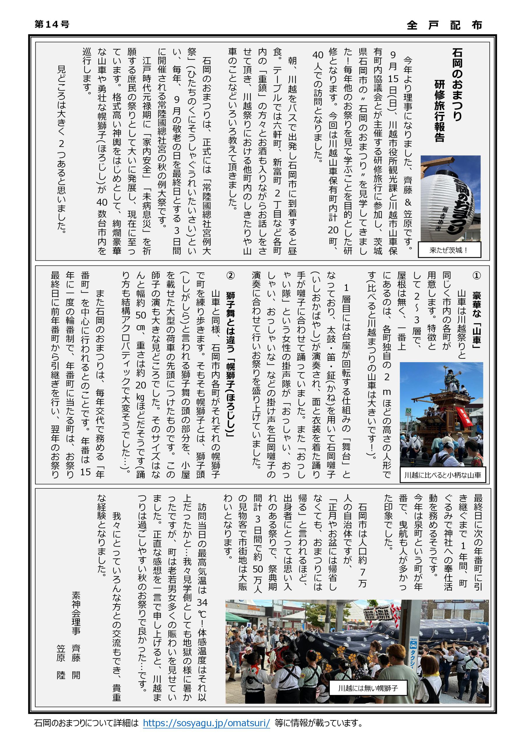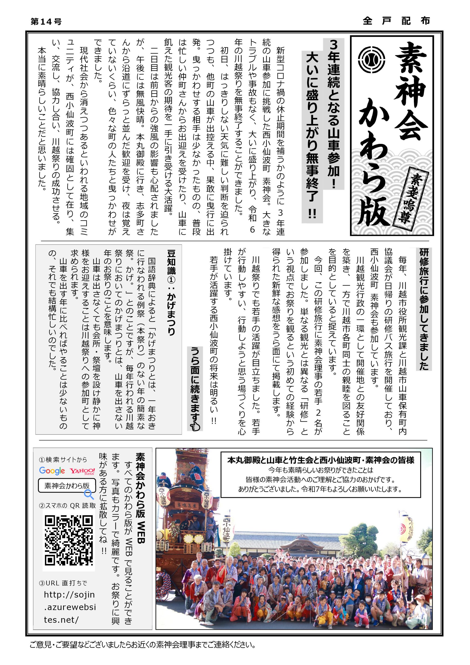 投稿日: 2024年12月16日2024年12月16日素神会かわら版 第14号 2024年12月発行 素神会かわら版 第14号・3年連続となる山車参加!大いに盛り上がり無事終了!!・研修旅行に参加してきました。・豆知識① かげまつり・石岡のおまつり 研修旅行報告 表面 裏面